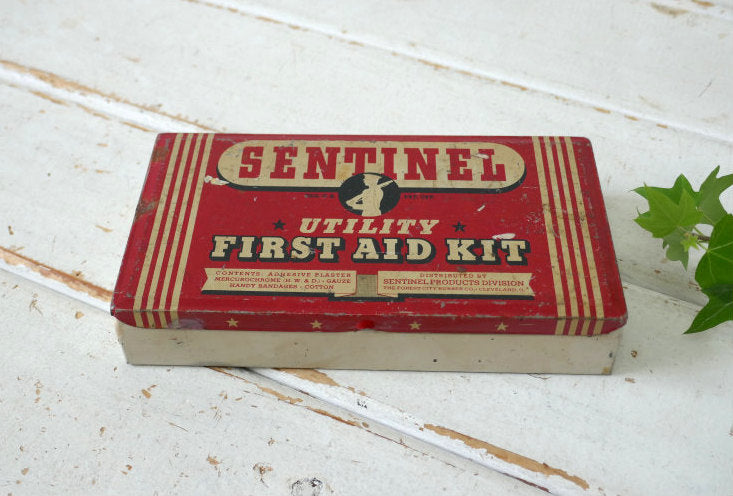 アメリカ西海岸・カリフォルニア州・ロサンゼルス郊外で見つけました・・『SENTINEL Utility First Aid Kit』ティン製・ヴィンテージ・救急箱です。