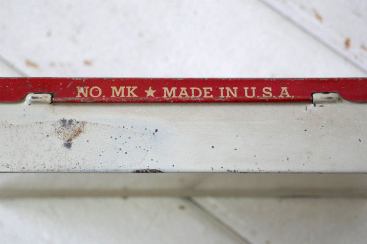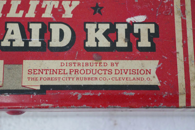 赤色×クリーム色ボディの両サイドに4本ライン&番兵のイラスト&【SENTINEL ★UTILITY★ FIRST AID KIT / DISTRIBUTED BY SENTINEL PRODUCTS DIVISION THE FOREST CITY RUBBER CO・ CLEVELAND. O.】、背面に【NO. MK★MADE IN U.S.A.】のプリントが入っております。