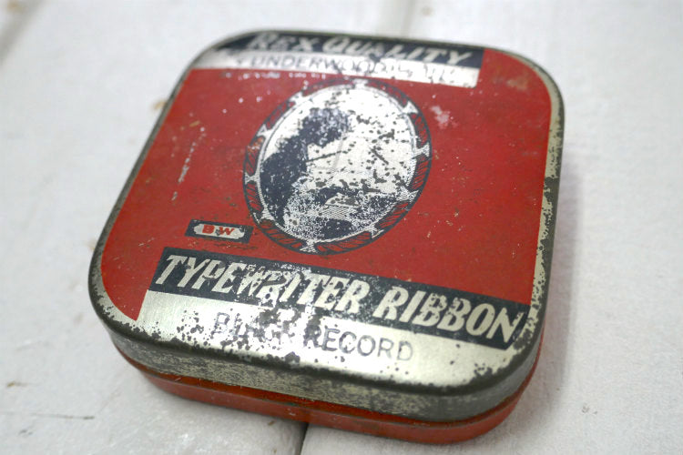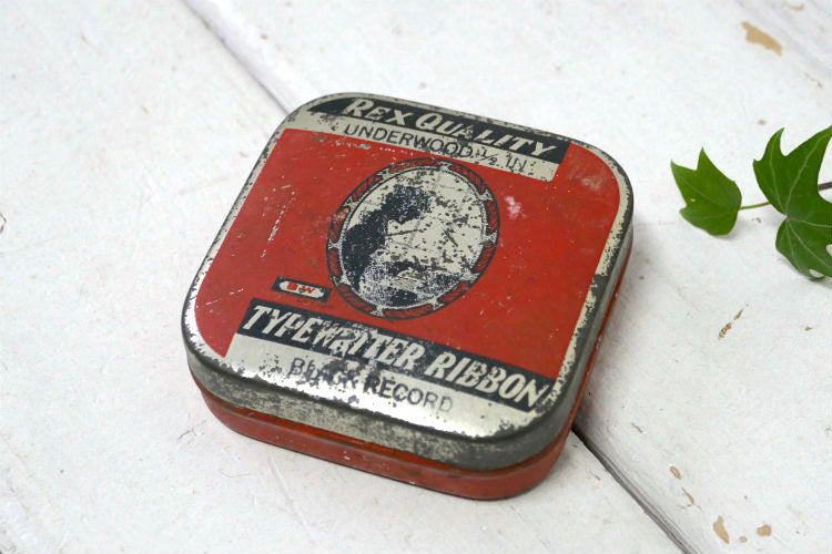 赤いボディの蓋に、タイプライターを打つ女性の絵柄&【REX QUALIYU INDERWOOD 1/2 1N / TYREWRITER RIBBON BLACK RECORD】、ボトムに【BLACKWELL WIELANDY COMPANY ST. LOUIS】の文字が入っております。