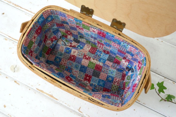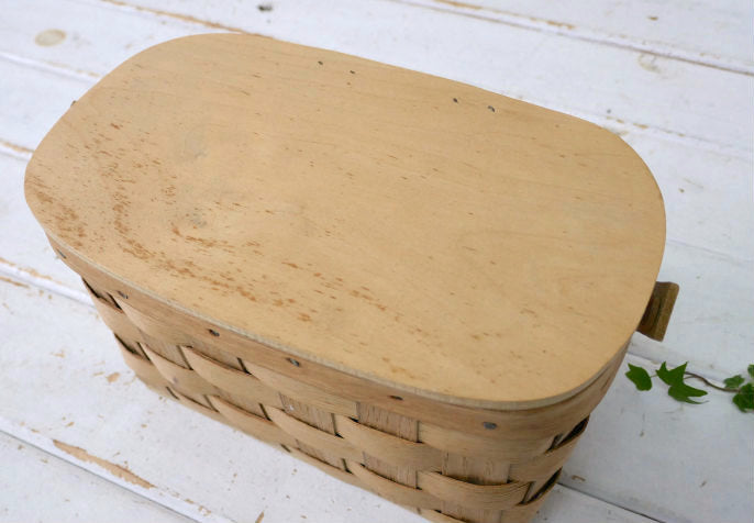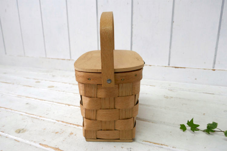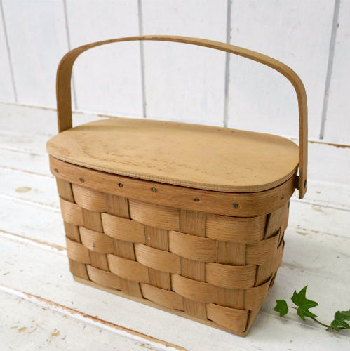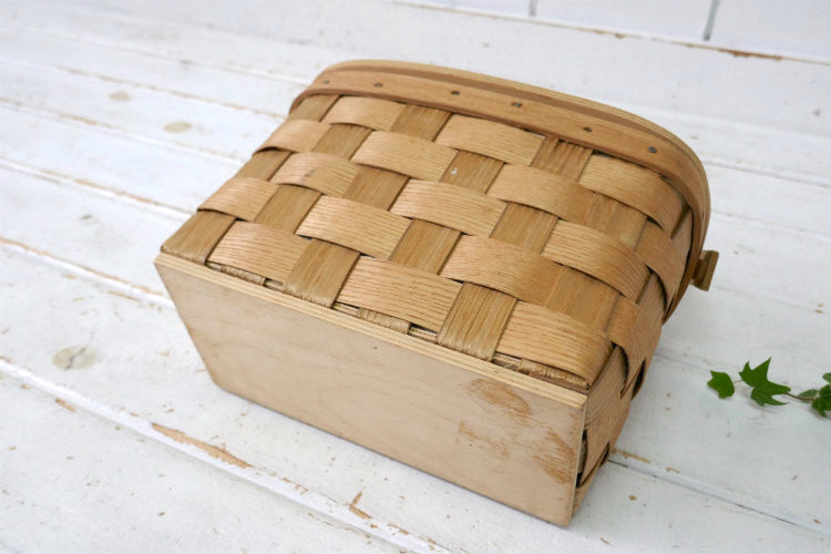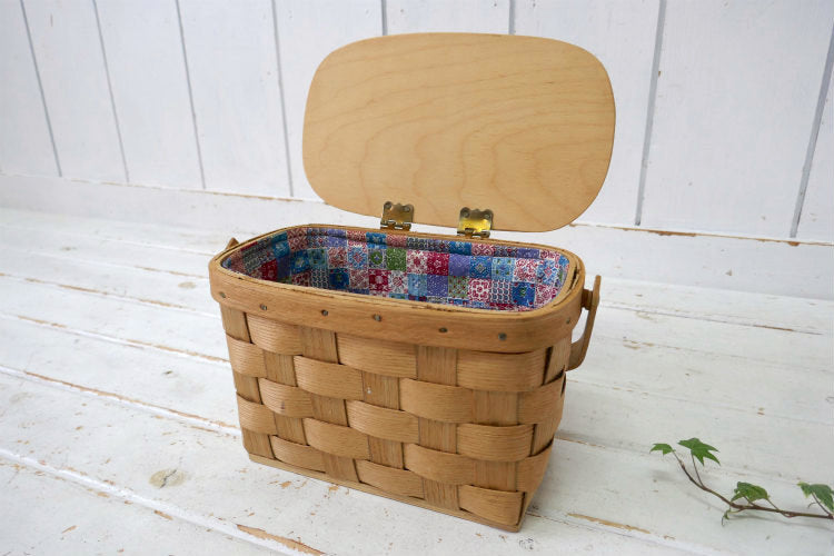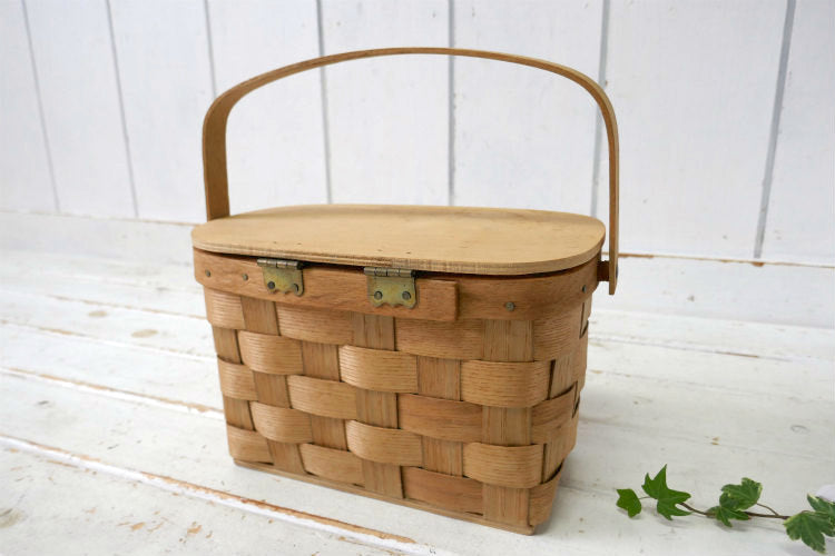 USA 木製 ヴィンテージ バスケット カゴバッグ ウッドバスケット ハンドバッグ ピクニック キャンプ 裁縫箱