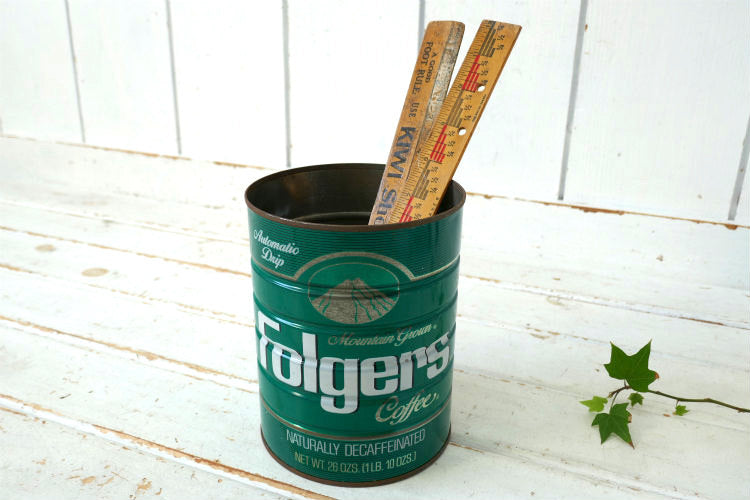 アメリカ西海岸・サンフランシスコで見つけました・・アメリカの老舗コーヒーブランド『Folgers COFFEE(フォルジャーズ)』NATURALLY DECAFFEINATEDのヴィンテージ・ティン缶です。