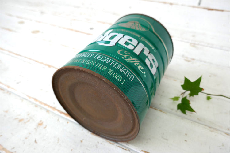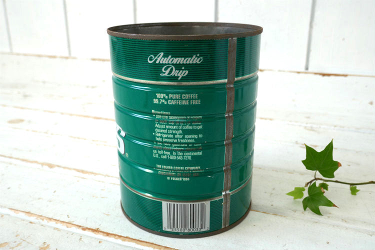 フォルジャーズ COFFEE デカフェ グリーン ブリキ製 ヴィンテージ コーヒー缶 USA NATURALLY DECAFFEINATED