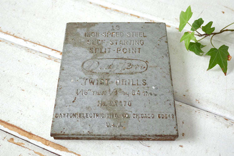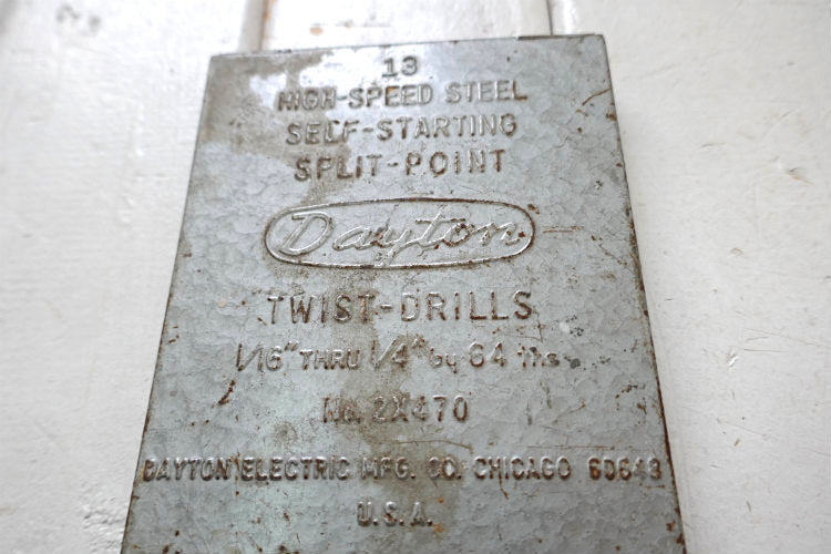 フタに【13 HIGH-SPEED STEEL SELF-STARTING SPLIT-POINT Dayton TWIST-DRILLS 1/16"THRU 1/4" by 64 the / No,2X470 / DAYTON ELECTRIC MFG. CO. CHICAGO U.S.A.】と、たくさんのエンボス文字が入っています。