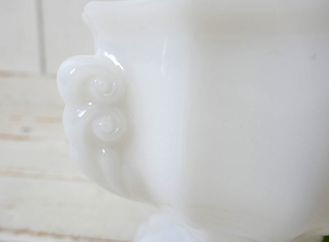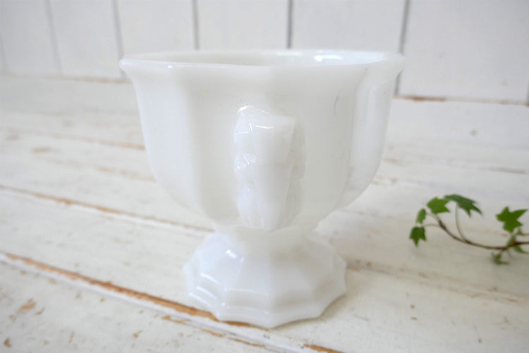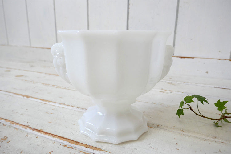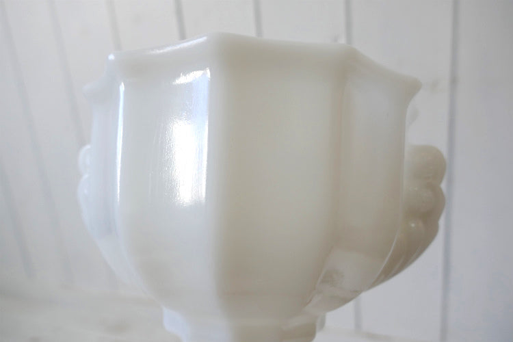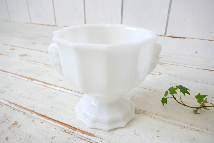 ホワイト・ミルクガラス製の足付きボウルで、両サイドにデコラティブな持ち手の装飾が施されたクラシックなデザインです。