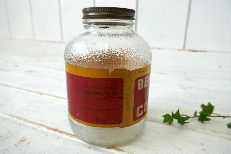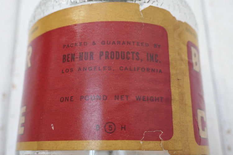 アメリカ西海岸・カリフォルニア州・サンフランシスコの田舎町の旧家で見つけました・・『BEN-HUR PRODUCTS, INC.』の【BEN-HUR COFFEE】ヴィンテージ・ガラスジャー(ガラス容器)です。