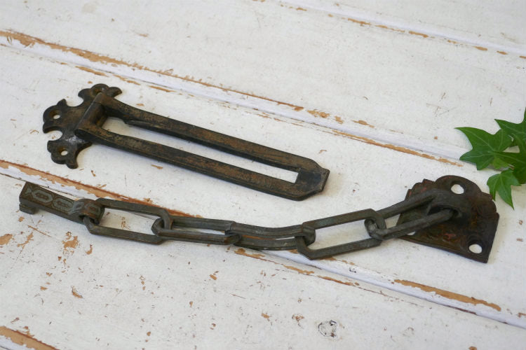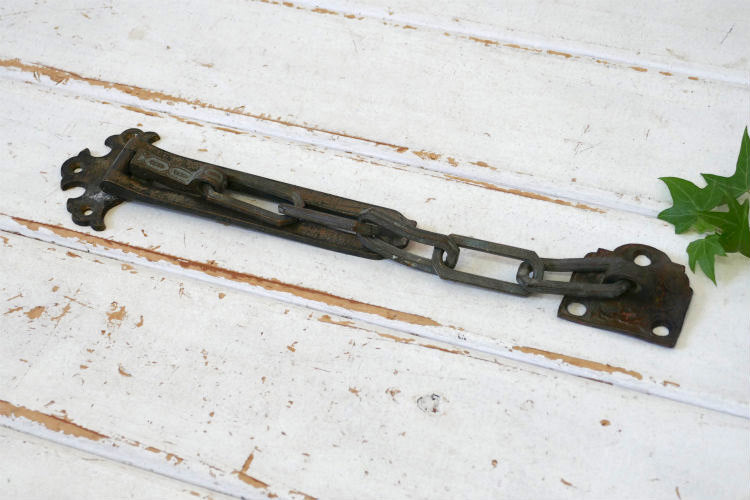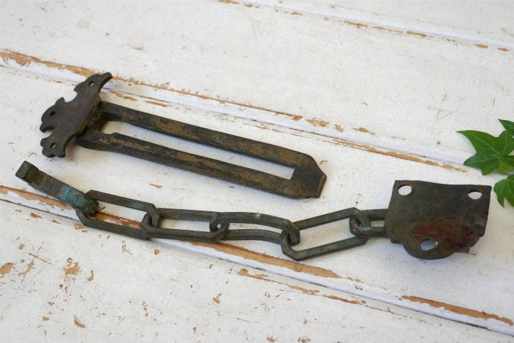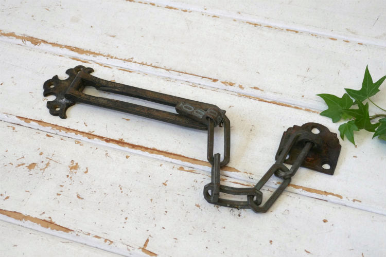 アメリカで実際にお屋敷で使用されていた、外開きタイプのドアに使用する、防犯補助金具のドアチェーンです。