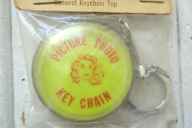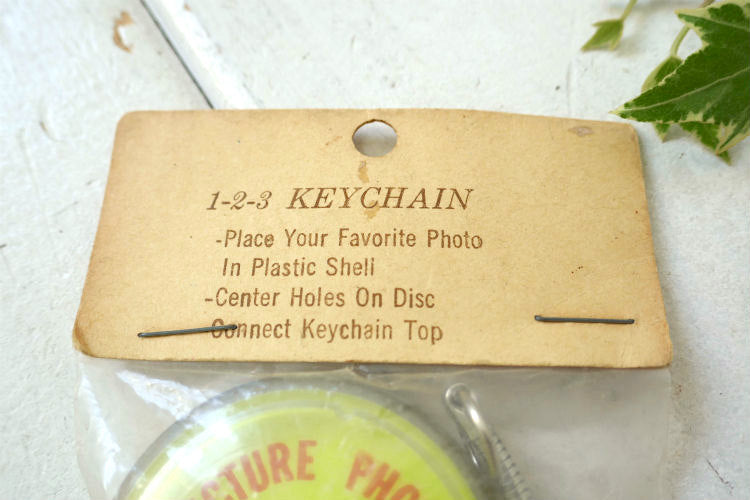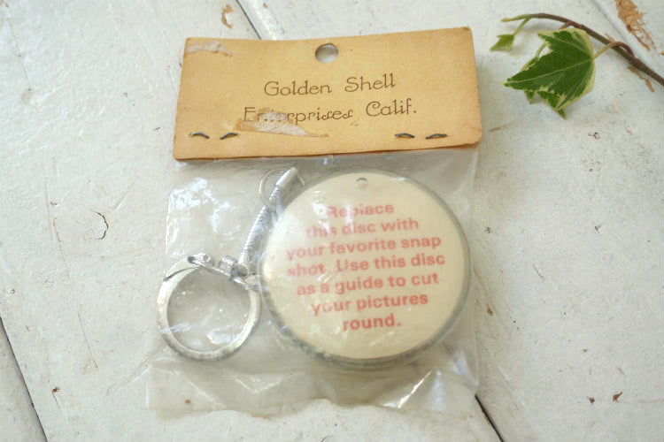 パッケージに【Golden Shell Enterprises Calif.】【1-2-3 KEYCHAIN ・Place Your Favorite Photo In Plastic Shell (プラスティックのシェルの中にお気に入りの写真を入れて下さい)・Center Holes On Disc Connect Keychain Top(中央の穴にキーホルダートップをつなぐ)】と説明書きがございます。