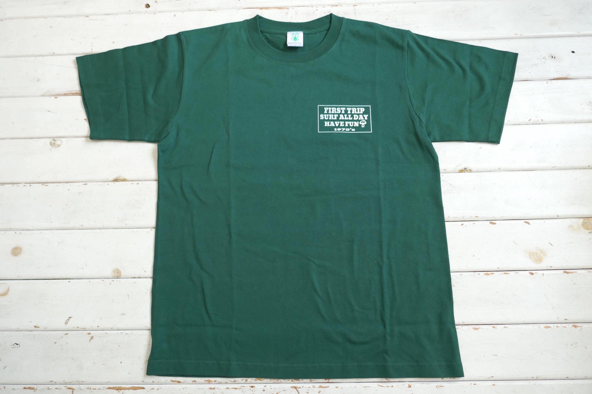 落ち着きのあるグリーンボディのフロント左胸に【FIRST TRIP SURF ALL DAY HAVE FUN 🍄 1970's】のロゴプリント(W9.8㎝×H5.5㎝)、バックに 【FIRST TRIP 1970 🍄 SURF ALL DAY】のカレッジロゴプリント(W19.5㎝×H15㎝)が入っています。