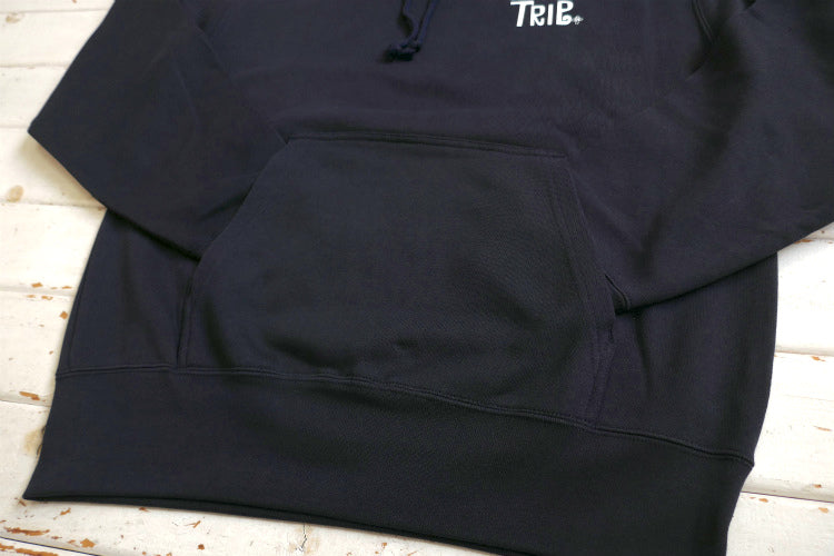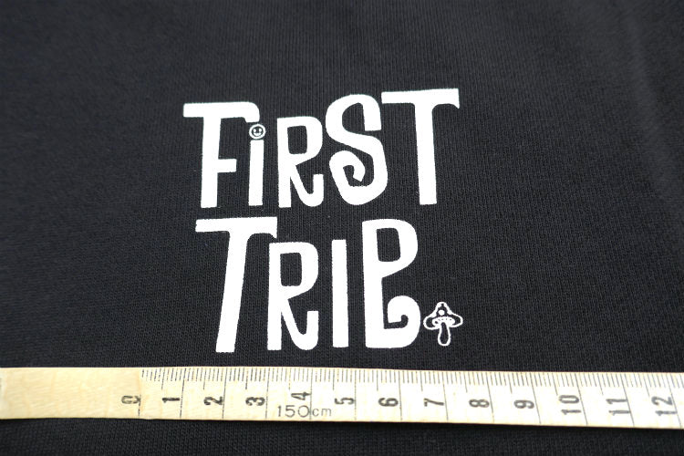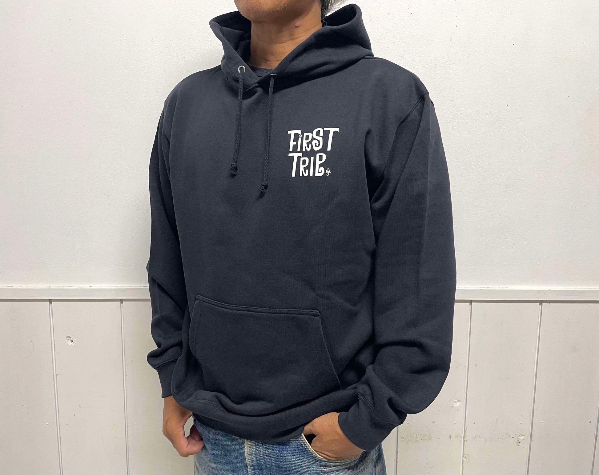 ネイビーボディのフロント左胸に【FIRST TRIP】のロゴプリント(W8×H7㎝)が入っています。