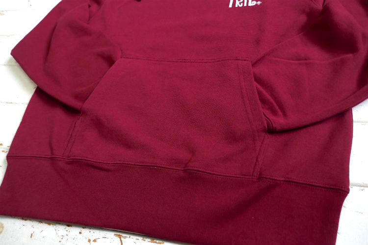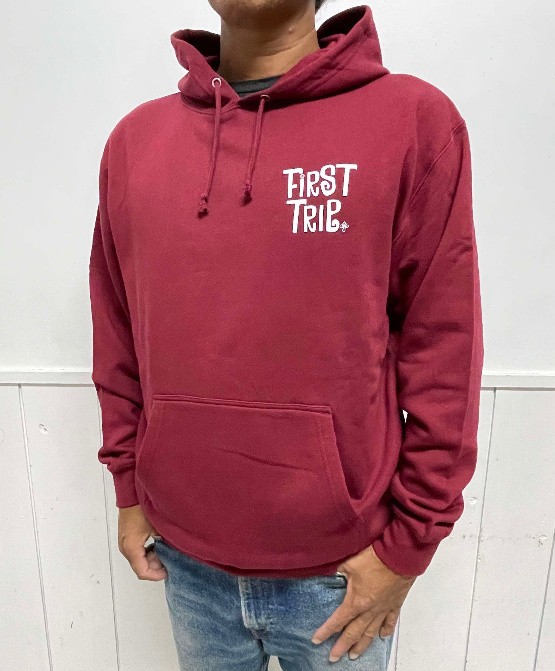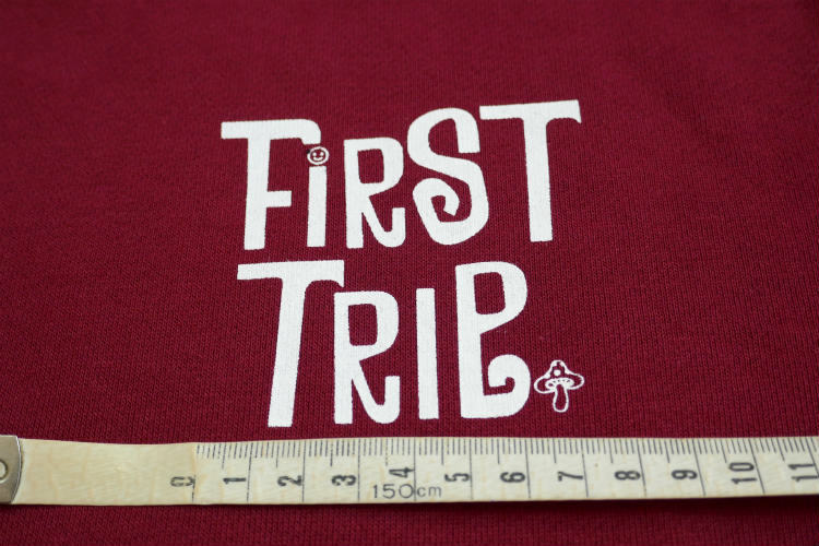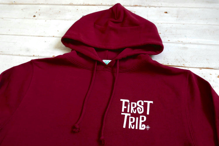 バーガンディボディのフロント左胸に【FIRST TRIP】のロゴプリント(W8×H7㎝)が入っています。
