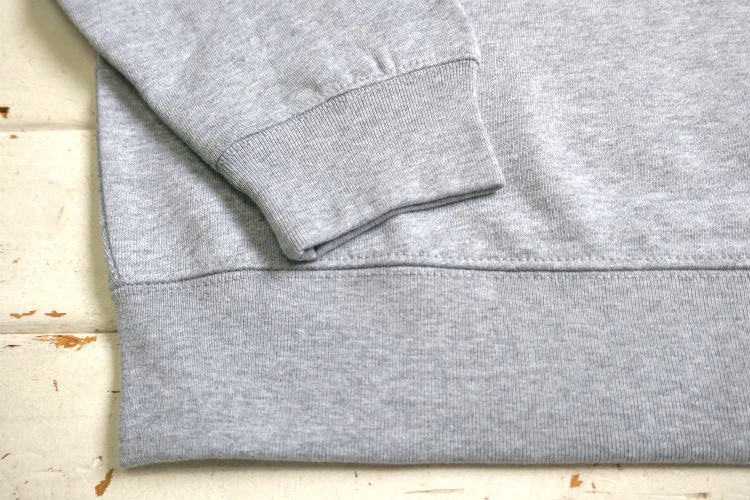 袖口&襟口のリブと身頃のシームラインはダブルステッチ始末、首リブもダブルステッチ、着込むほどに味が出るスウェットです。