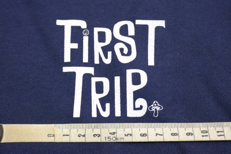 インディゴカラーボディのフロント左胸に【FIRST TRIP】のロゴプリント(W8×H7㎝)が入っています。