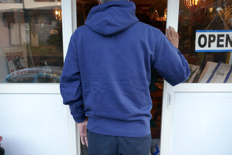 袖口・襟口のリブと身頃のシームラインはダブルステッチ始末、フードは二重仕様、細部までこだわり満載で、着込むほどに味が出るスウェットパーカーです。