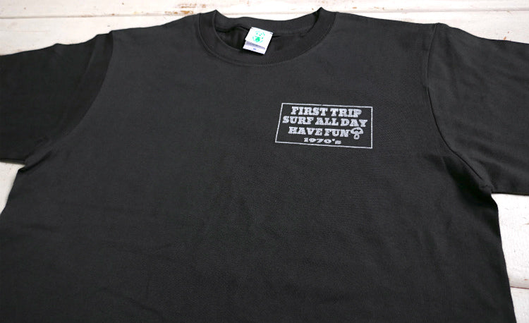 スミ黒ボディのフロントに【FIRST TRIP SURF ALL DAY HAVE FUN 1970's】のロゴプリント(W10.5㎝×H6.0㎝)が入っています。