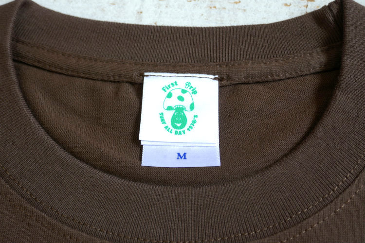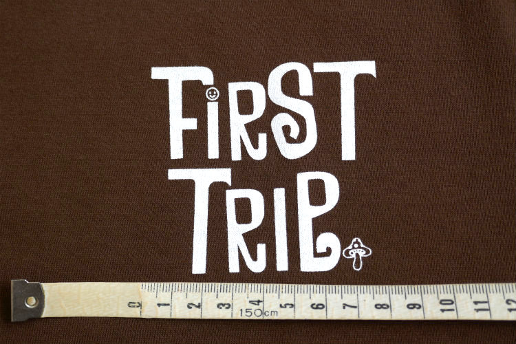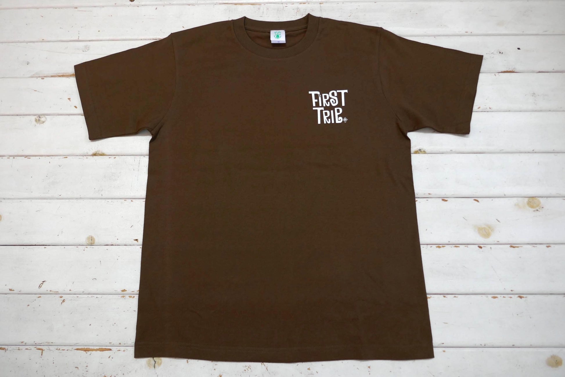 ダークブラウンボディのフロント左胸に【FIRST TRIP】のロゴプリント(W8×H7㎝)が入っています。