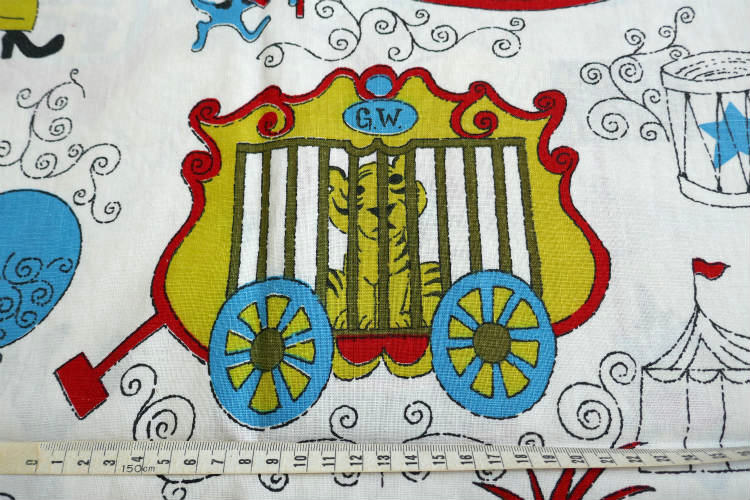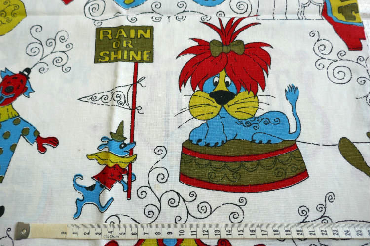 カラフルな″PENNY CIRCUS″の風船を持ったピエロや、一輪車に乗ったサル、″RAIN OR SHINE″のフラッグを持った犬、″BIG TOP″バナーを背負ったのカバ、ボール芸をしているオットセイ、頭のリボンが可愛いライオン、檻の中のトラ アニマルなど、とてもキュートな総柄プリントです。