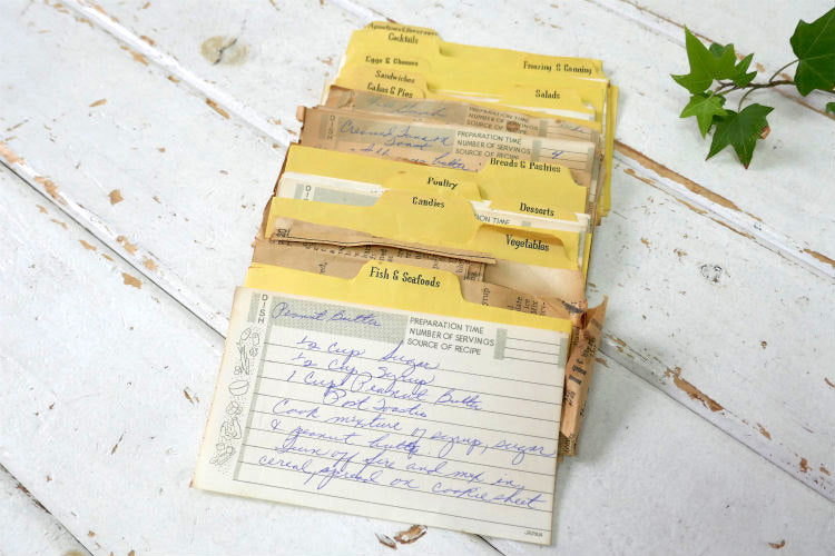 内側に、手書きのレシピカードや雑誌の切り抜きレシピ(印刷物)・未使用のレシピカード数枚・料理別のインデックスカードが数種類、入っております。