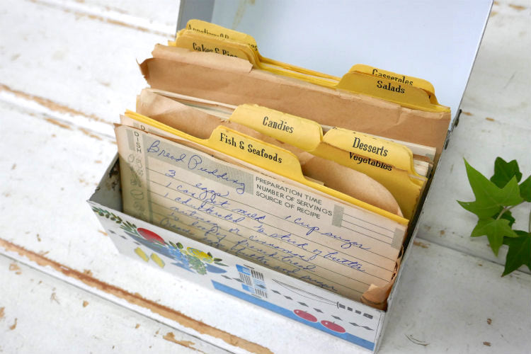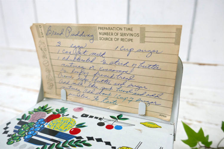 RECIPES RECIPE REST レトロ フルーツ柄 折り畳み式 カードスタンド レシピカード付き ティン製 50's ヴィンテージ レシピボックス レシピ缶 里帰り品