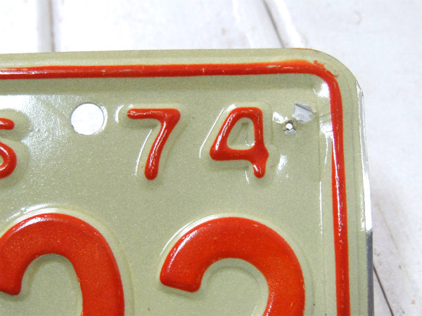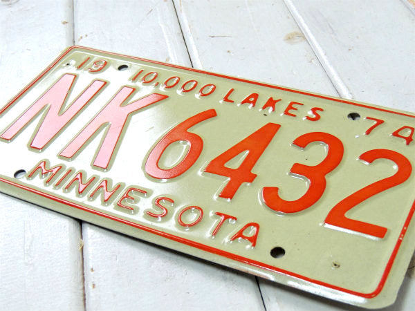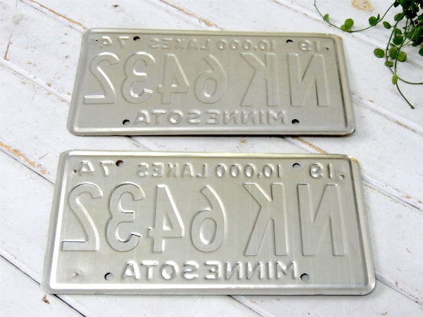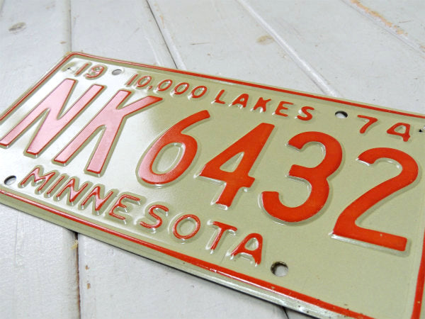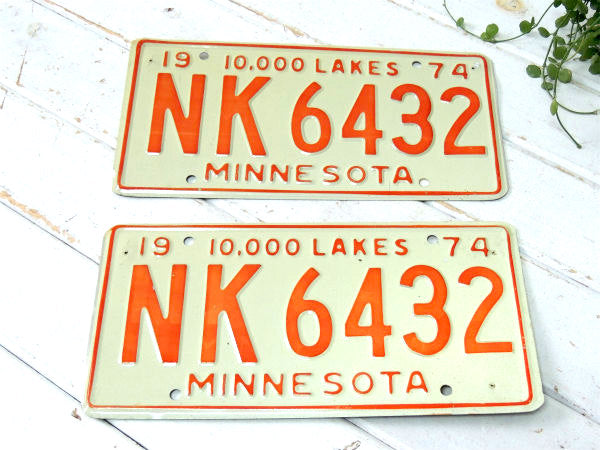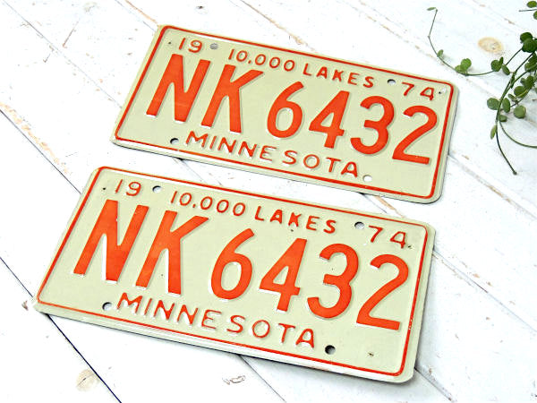 アメリカ・ミネソタ州 1974年のヴィンテージ・ナンバープレート・2枚セットです。 ホワイトベースに【1974/10,000 LAKES/NK 6432/MINESOTA】とオレンジ色のエンボス文字が入っております。