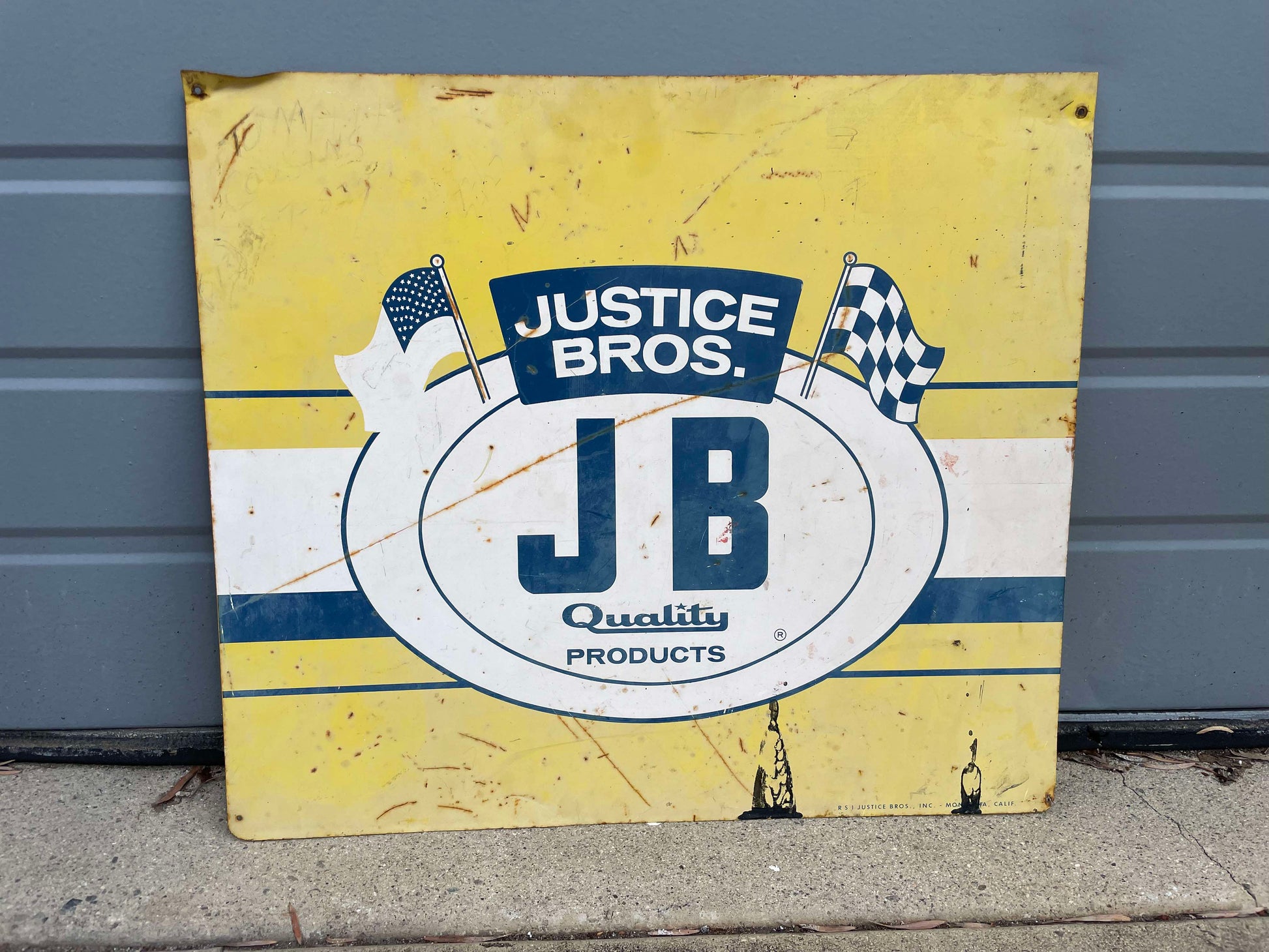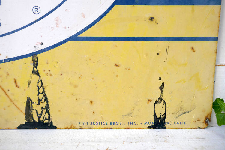 アメリカ西海岸 カリフォルニア州 ロサンゼルスで見つけました・・JUSTICE BROS.Quality PRODUCTS ジャスティス ブラザーズ オイルメーカー スチールサイン・ヴィンテージ 看板 サインプレートです。