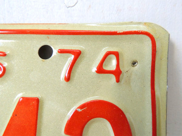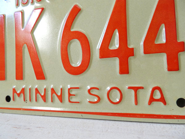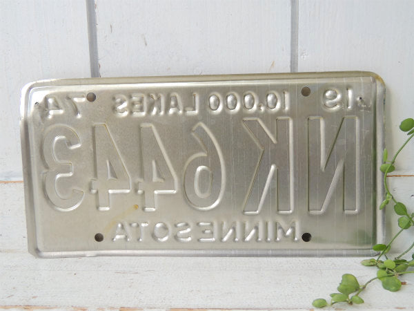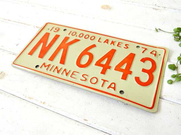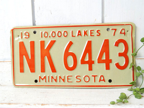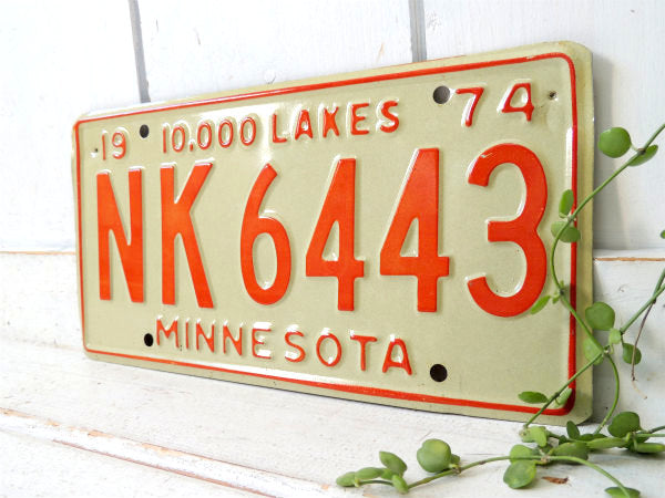 アメリカ・ミネソタ州 1974年のヴィンテージ・ナンバープレートです。 ホワイトベースに【1974/10,000 LAKES/NK 6443/MINESOTA】とオレンジ色のエンボス文字が入っております。