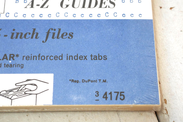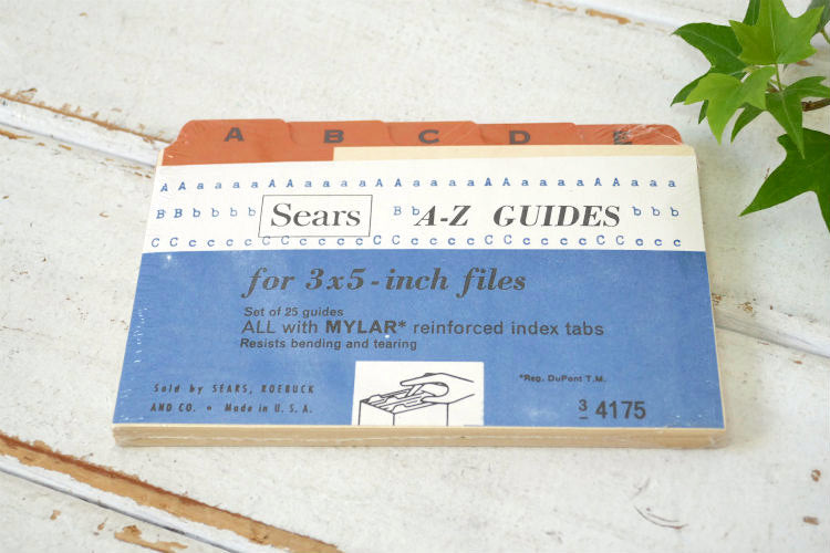 クリアパッケージ内側の紙タグに【Sears A-Z DUIDES for 3×5 -inch files Set of 25 guides ALL with MYLAR reinforced index tabs Resists bending and tearing】【Sold by SEARS, ROEBUCK AND CO.・ Made in U.S.A.】【Reg. DuPont T.M. 3-4175】とございます。