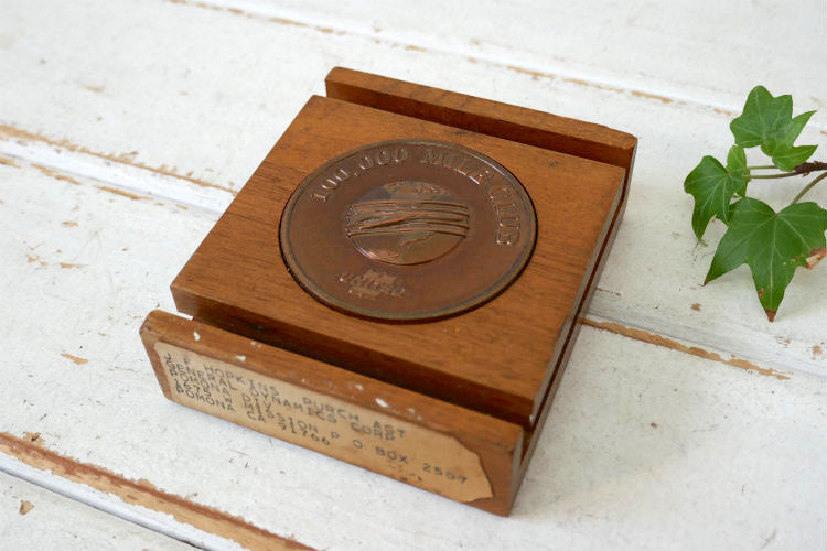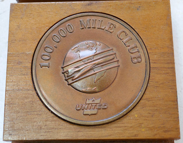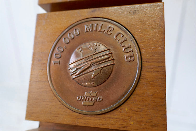 木製の台座にトップにメダルが付いており、アメリカ地図の上空を飛ぶユナイテッド航空機の立体的な絵柄&【100,000 MILE CLUB / UNITED】のエンボスロゴが入っています。