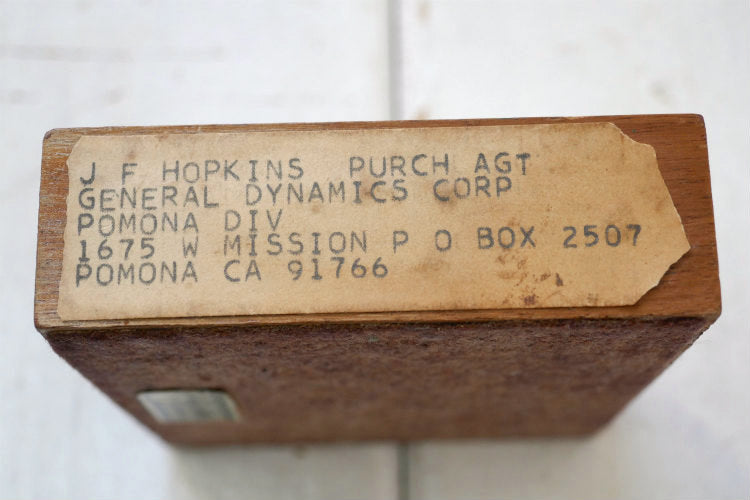 フロントの紙タグに【JF HOPLONS PURCH AGT / GENERAL DYNAMICS CORP POMONA DIV / 1675 W MISSION P O BOX 2507 POMONA CA 91766】とございます。