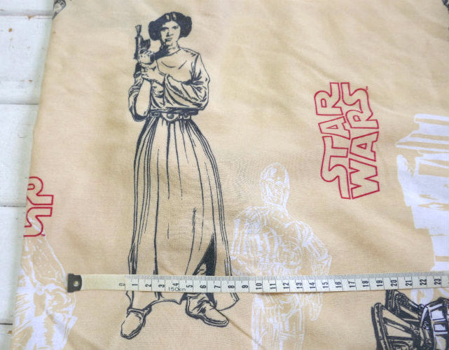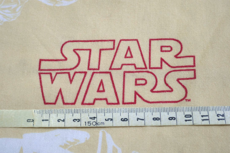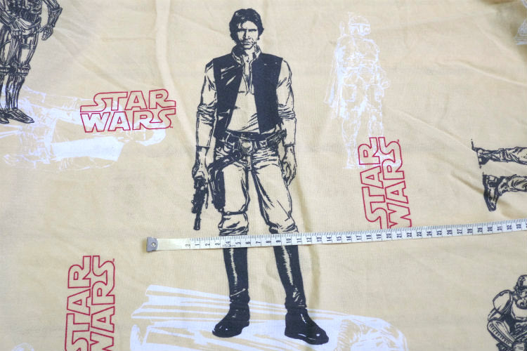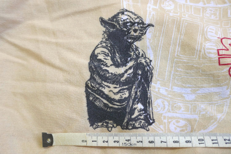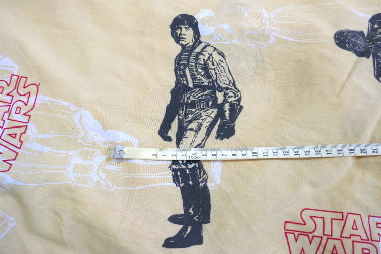 ベージュ柄ベースに、ハンソロやダースベイダー・ヨーダ・R2-D2・C-3PO・レイアオーガナ等の総柄プリントです。