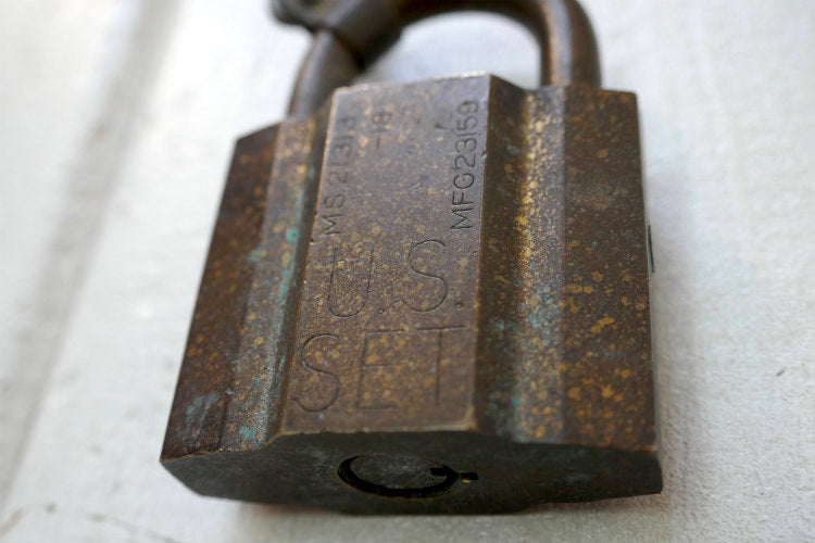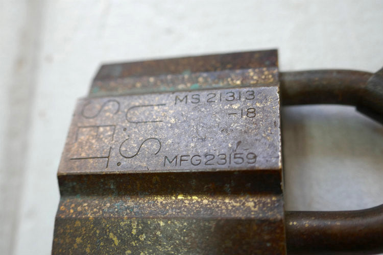 ずっしりと重みのある真鍮製の南京錠で、表面に【U.S. SET / MS 21313-18 / MFG 23159】、背面にシリアルナンバー【GEC 10661】の刻印が入っています。