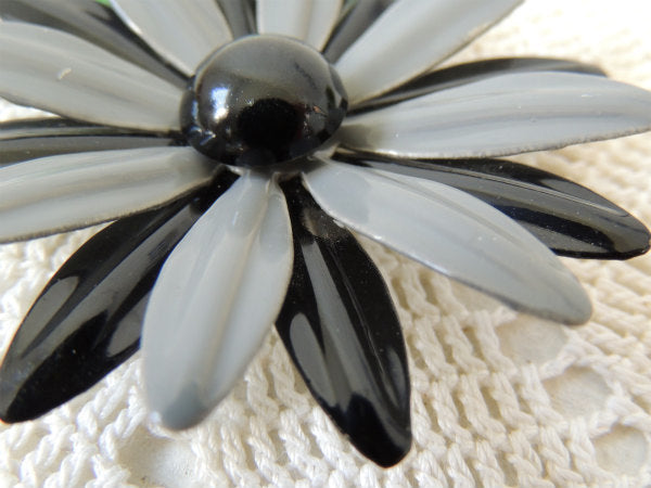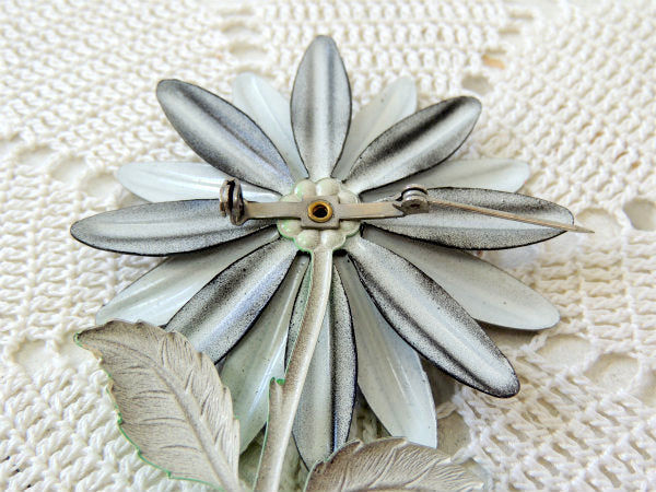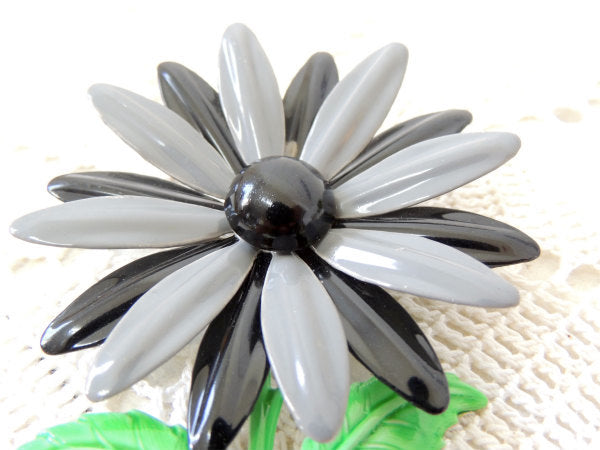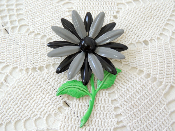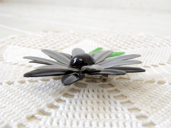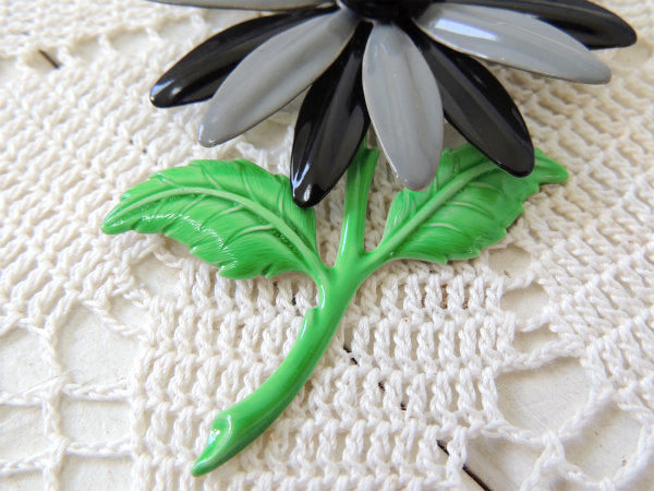 アメリカ西海岸・サクラメントでみつけました・・1960's~1970's頃のフラワーモチーフ・ヴィンテージ・ブローチです。 ツヤのあるグレー×渋めのブラック×葉の部分は鮮やかグリーンの、レトロモダンな可愛いお花&葉のデザインです。