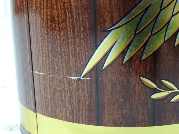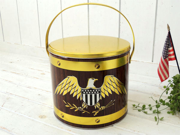 ウッド柄ボディのブリキ缶に、胸に星条旗が入った大きなイーグルの両面プリントが入っており、インパクト大です!!