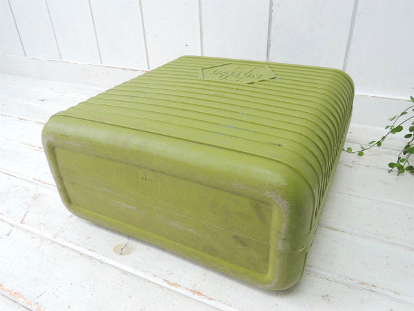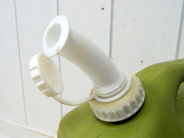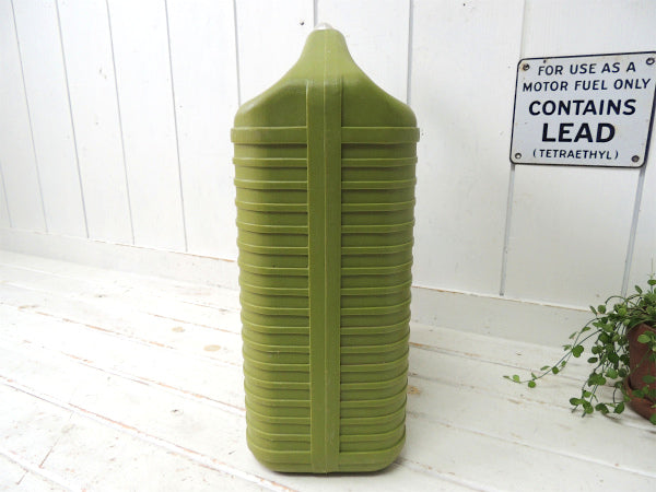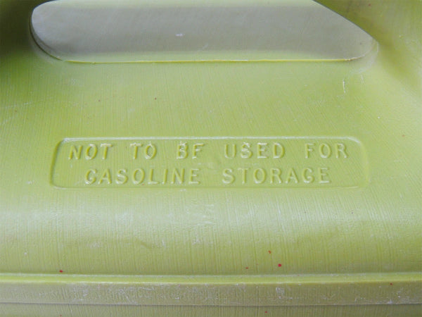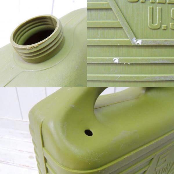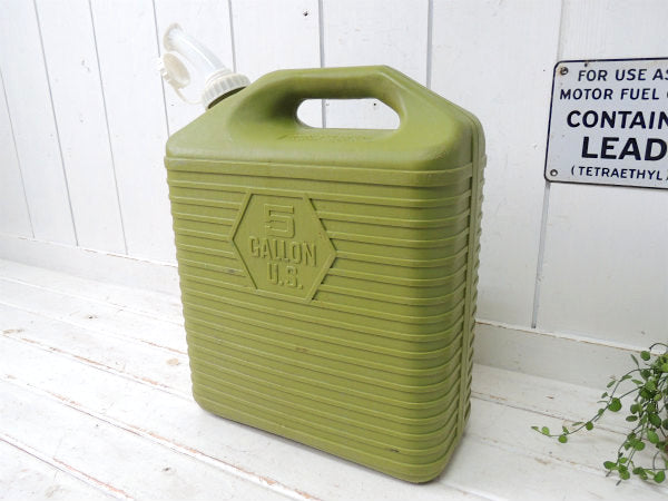オリーブグリーン色のしっかりとしたポリエチレン製ボディの両面に【5 GALLON U.S.】、上部に【NOT TO BE USED FOR GASOLINE STORAGE】、ボトムに【AMOCO 0528 U.S.A.】のエンボス文字、ボディ全体に細かなボーダーデザインが入っております。
