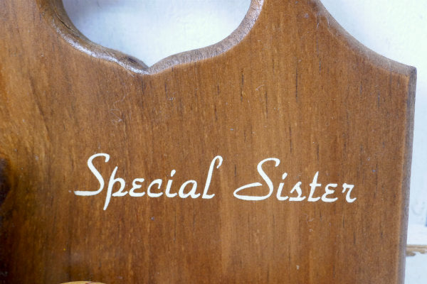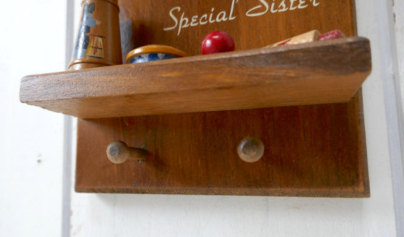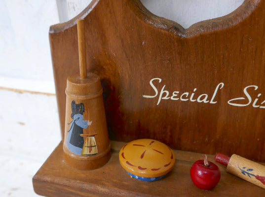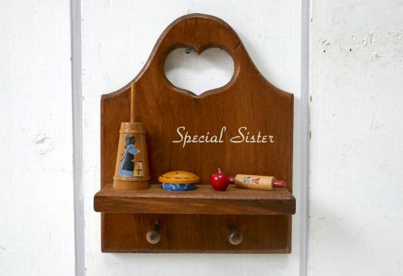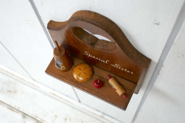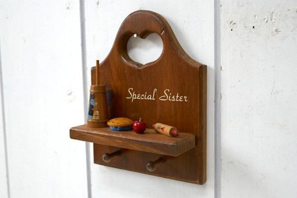 【Special Sister】の文字が入っており、棚板の上にはパイやリンゴ・ローリングピンなどミニチュアの装飾が施され、下部にはフックが2個付いております。