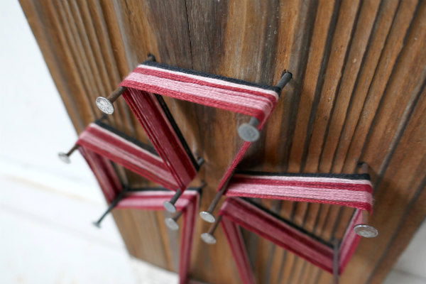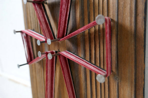 木製プレートに釘と糸でクロスアート ストリングアート ハンドメイドが施されています。