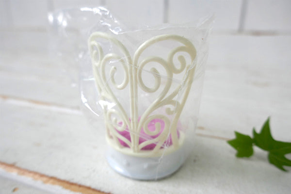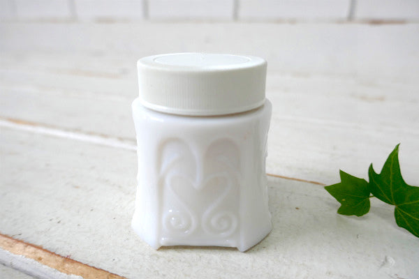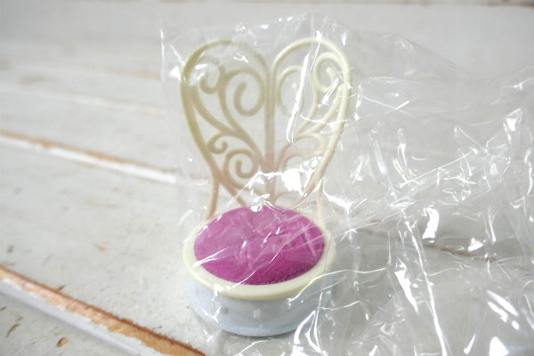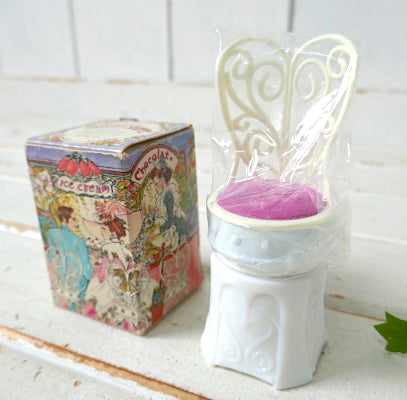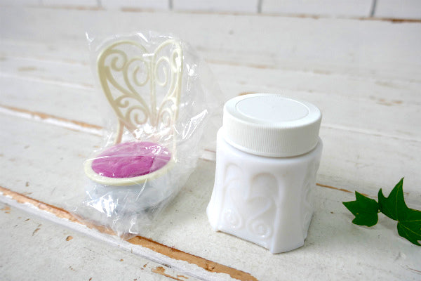 メルヘンなチェア(椅子)形をした香水瓶で、台座はキュートなエンボス模様入りのミルクガラス製、上部はプラスティック製、ピンク色の座面はピンクッション(針山)です。