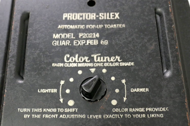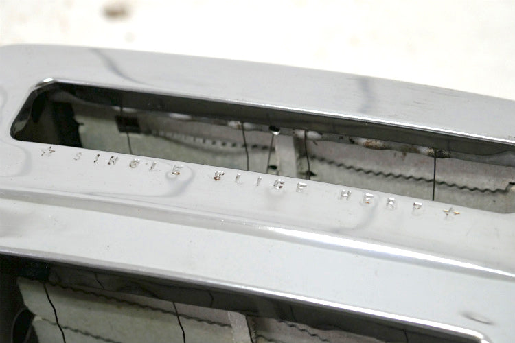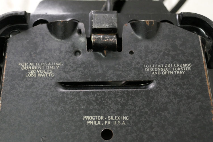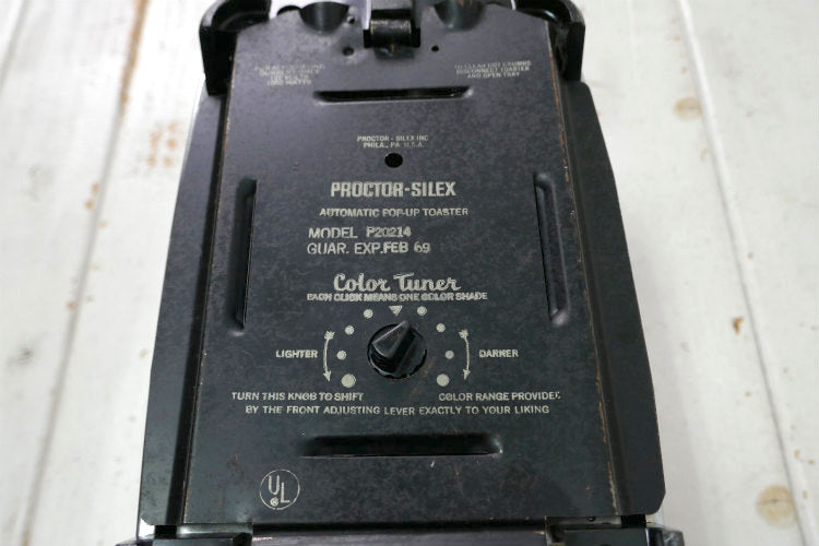 上部に【☆ SINGLE SLICE HERE ☆】の刻印、ボトムに【FOR ALTERNATING QURRENT ONLY 120 VOLTS 1050 WATTS 】【PROCTOR-SILEX INC PHILA., PA. U.S.A.】【AUTOMATIC POP-UP TOASTER】【MODEL P20214 GUAR. EXP. FEB 69】とございます。