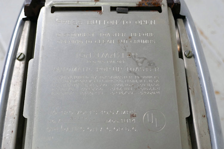 サイドに【TOASTMASTER】ロゴ、ボトムに【TOASTMASTER REG. U.S. PAT. OFF. 】【AUTOMATIC POP UP TOASTER】【110-120 VOLTS-10.5 AMPS. NO.A 3613651 MOD.1B14】とございます。