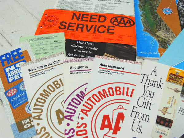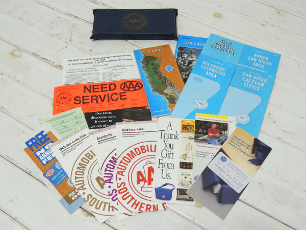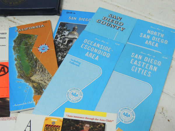 トリプルエーのロゴプリントが入ったビニール製ケースに、【Welcome to the Club(ようこそクラブへ)】【Accidents(事故)】【Auto Insurance(自動車保険)】【CALIFORNIA地図】【SAN DIEGO地図】【SAN DIEGO COUNTY地図】【OCEANSIDE-ESCONDIDO AREA地図】【SAN DIEGO EASTERN CITIES地図】【NORTH SAN DIEGO AREA地図】などが入っております。