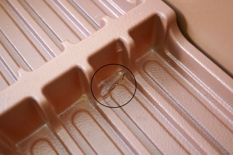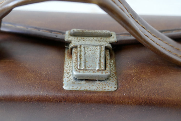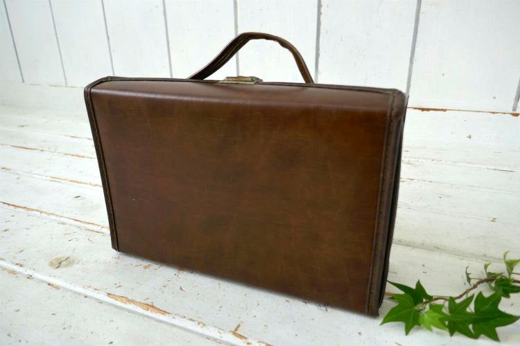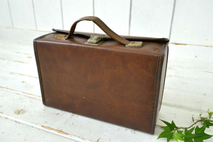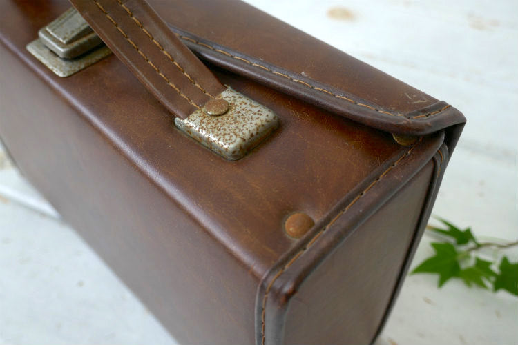 表面はブラウンのフェイクレザー(ビニール素材)製、持ち手も同素材、 回りはリベットでしっかり固定され、内側の仕切りトレイはプラスティック製です。