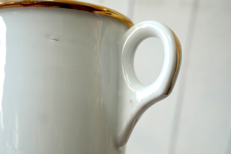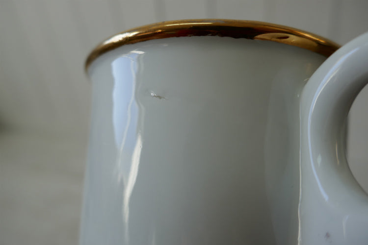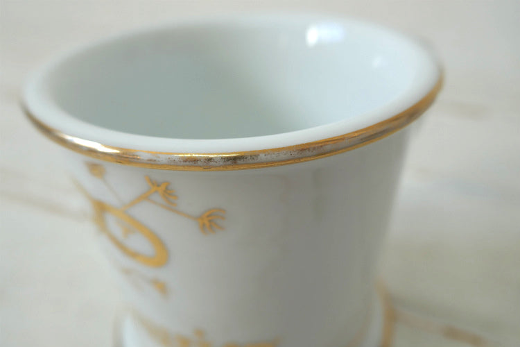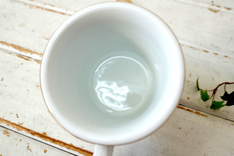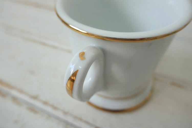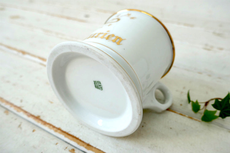 ホワイトの陶器製カップに金色ゴールドの英字と柄が入っております。