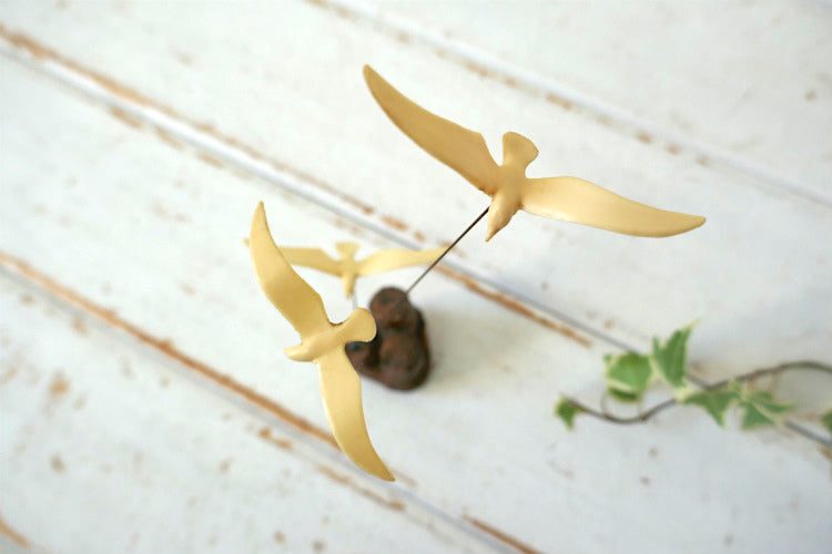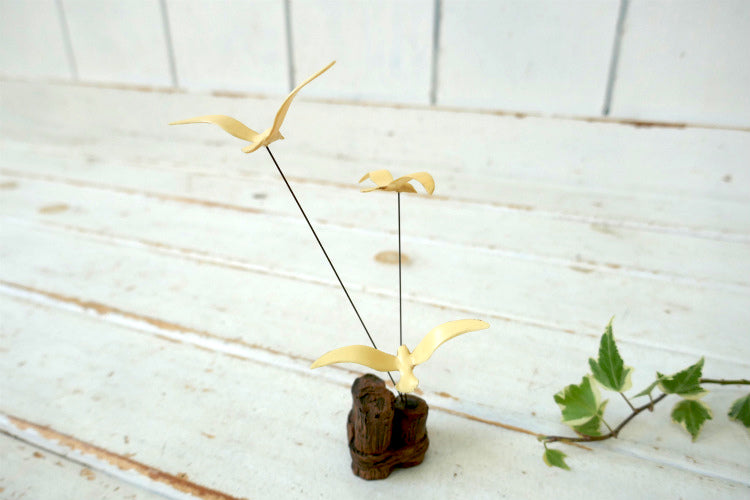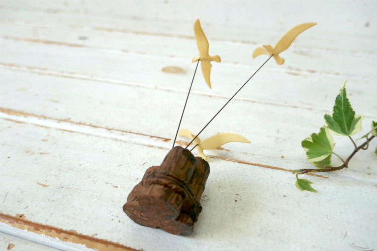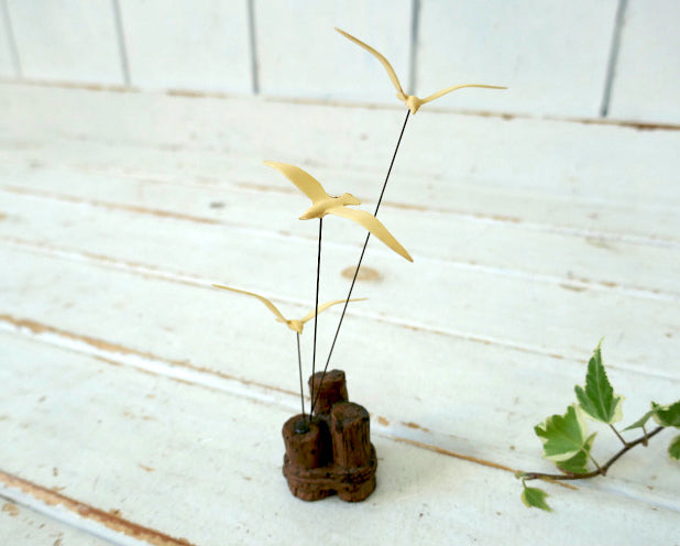 リアルなウッド柄の樹脂製の台座から出たワイヤーの先に、3羽のカモメが飛んでいる、アート品です。