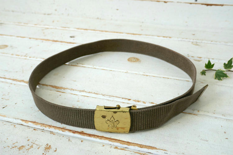 ボーイスカウトの紋章エンボスロゴが入ったバックルは真鍮製、ベルト部分はカーキカラーの布製です。