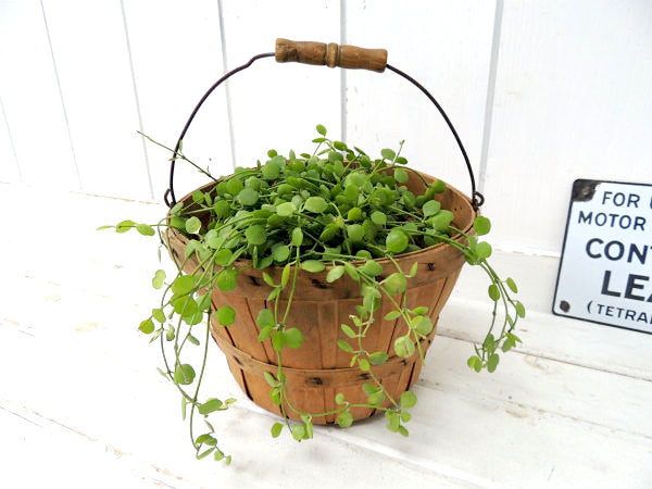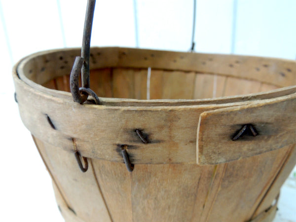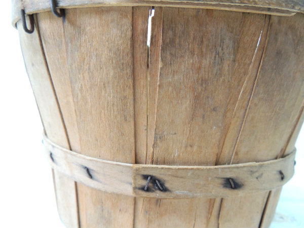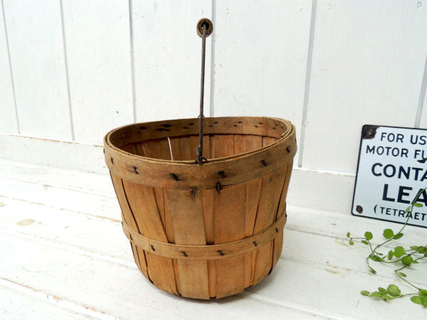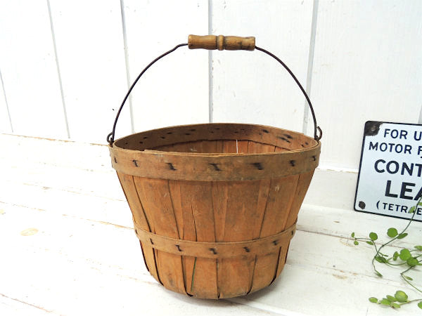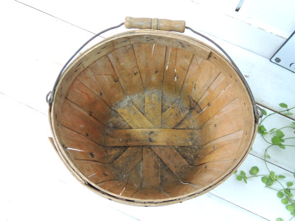 【シャビー】ハンドル付きの木製・ヴィンテージ・バスケット/ウッドバスケット・キャリーバスケット