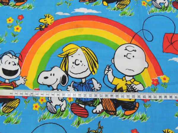 ブルー色ベースに、カラフルな虹の下で、スヌーピー&ルーシー&リラン&ペパーミントパティ、チャーリーブラウンがカイトをあげている、カラフルなとっても可愛いプリントです。