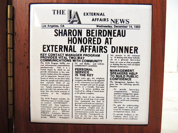 左側に【COMMUNITY】【CONVERNMENT】【PRESS】【SPECIAL PUBLICS】【SPEAKERS BUREAU】の英文字と細かな絵柄が彫刻されており、右側は白地タイル上に1983年の新聞デザインがプリントされております。