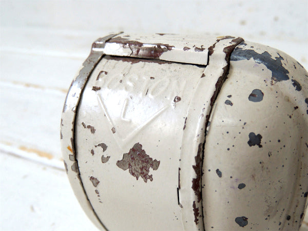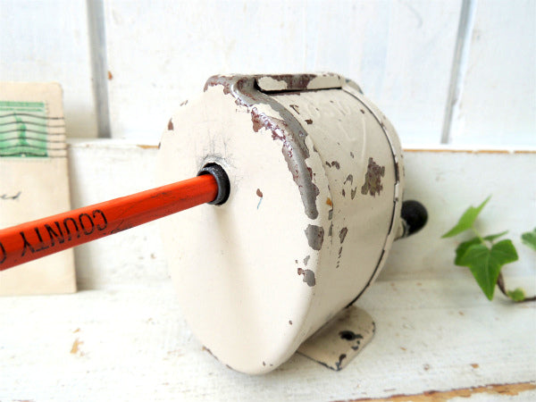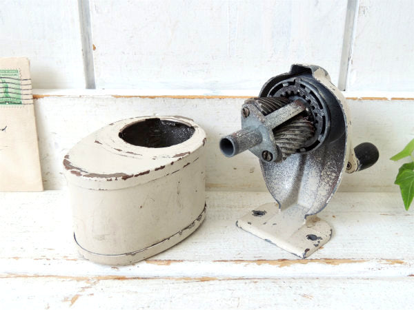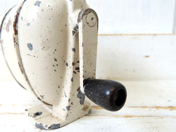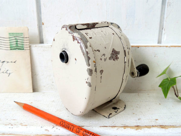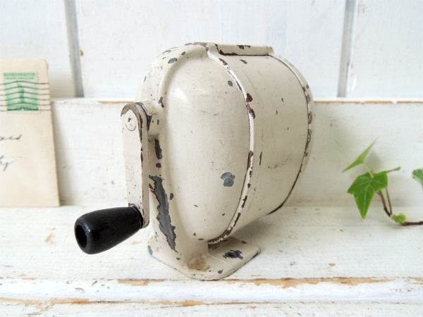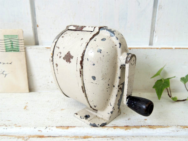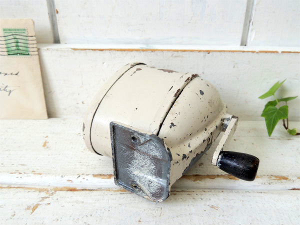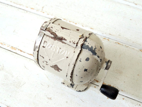 アメリカ西海岸・サンフランシスコで見つけました・・アイボリー色にペイントされている・シャビーな【BOSTON L】スチール製・ヴィンテージ・ペンシルシャープナー(鉛筆削り)/木製ハンドルです。