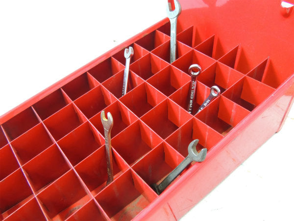 アメリカ西海岸・ロサンゼルスで見つけました・・工業系・赤色のメタル製・仕切り付きヴィンテージ・ツールボックス(キャリーボックス・メタルケース・工具箱)です。