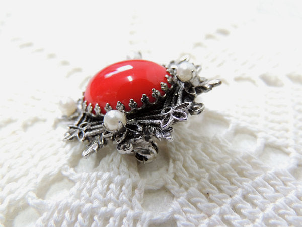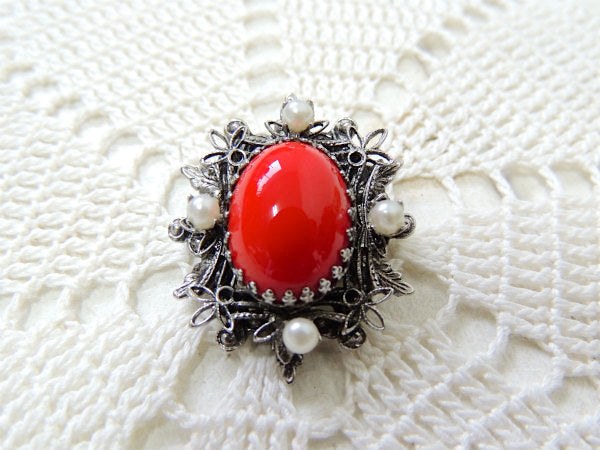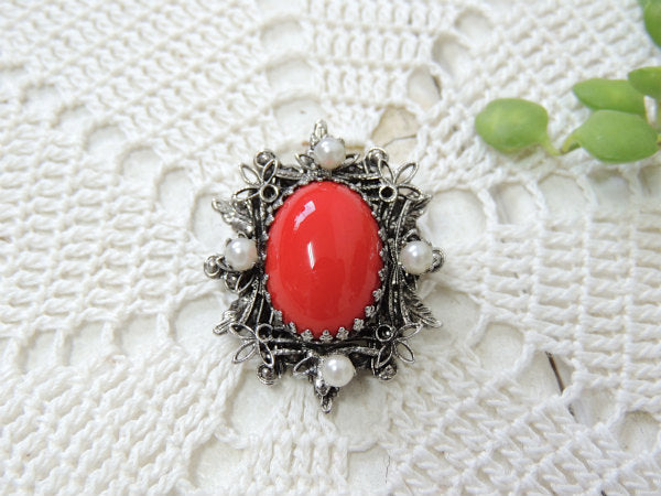 オーバル型の赤色×小さなパール調×フラワーモチーフ・ヴィンテージ・ブローチ/スチュームジュエリー