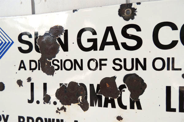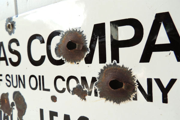 アメリカ南部・テキサス州・ヒューストン近郊で見つけました・・インパクト大! 多数の弾痕付き!!! "SUN OIL"オイルカンパニー・看板・ヴィンテージ・ホーロサインです。